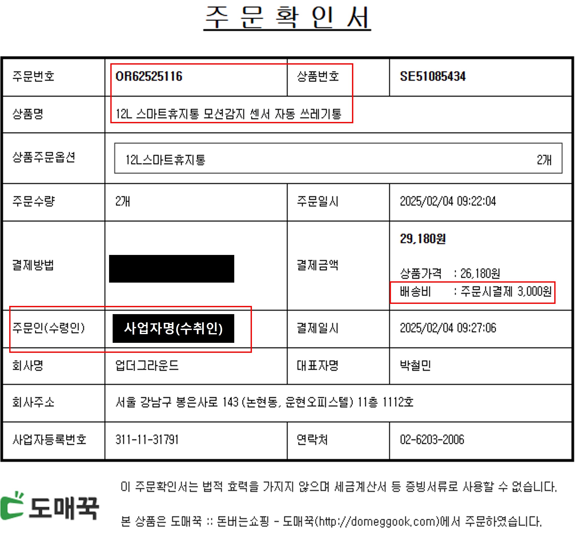 아래와 같이 동일한 주문에 택배사 정보, 수취인, 사업자 정보가 확인되면 증빙이 가능합니다.