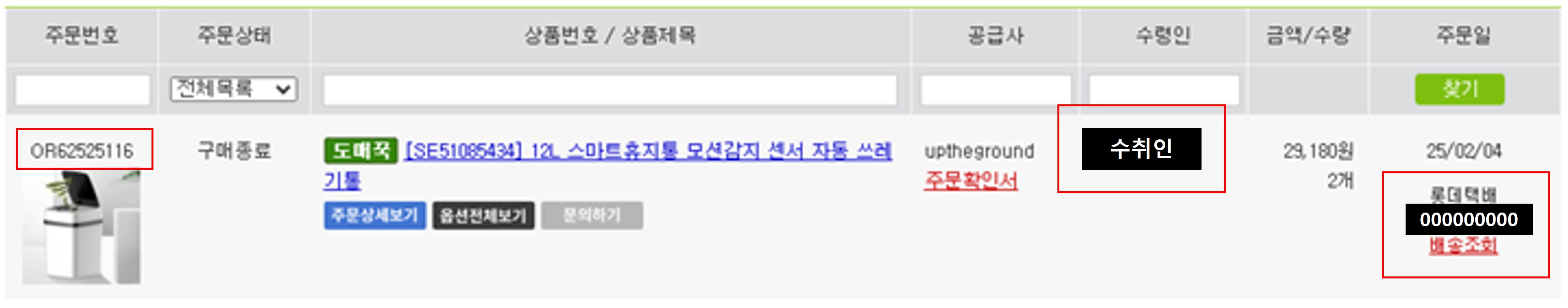 * 택배사명, 택배번호, 수취인 정보 일부가 표기된 자료 - 주문상세정보 캡처본