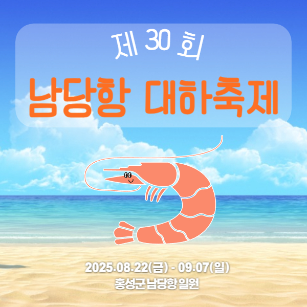 올해로 제30회를 맞는 홍성 남당항 대하축제는 다양한 체험 활동과 제철의 신선한 대하를 맛볼 수 있는 축제입니다. 2025년 가을. 남당항에서 맛과 추억을 듬뿍 담아가세요!