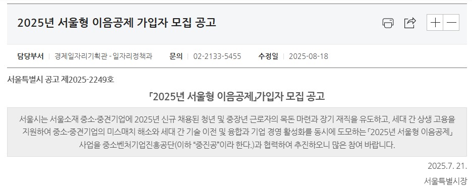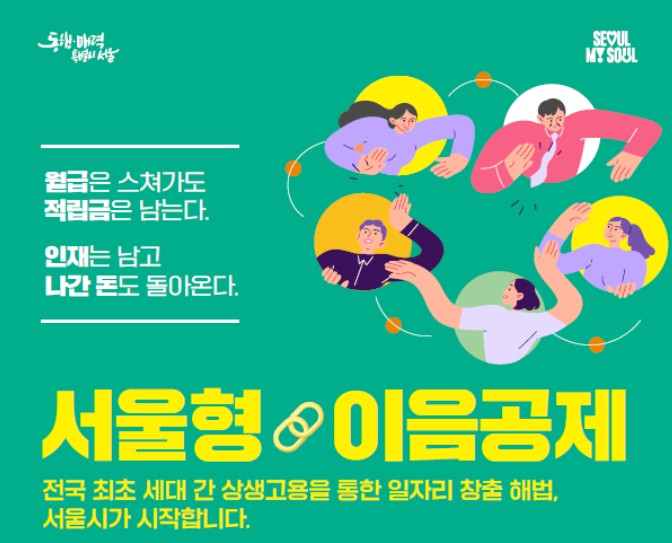 | 서울형 세대이음 | 청년, 중장년 동반으로 1년 이상 고용시 최대 3년간 기업부담금 576만원 전액 환급 |