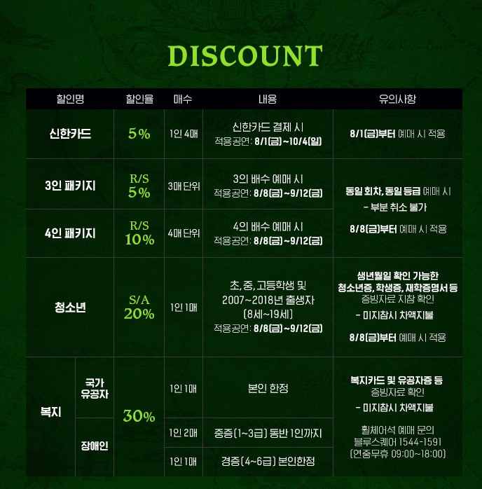 휠체어석 예매: 공연일 기준 3일 전까지 가능, 전화 예매 필요(1544-1591)