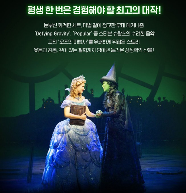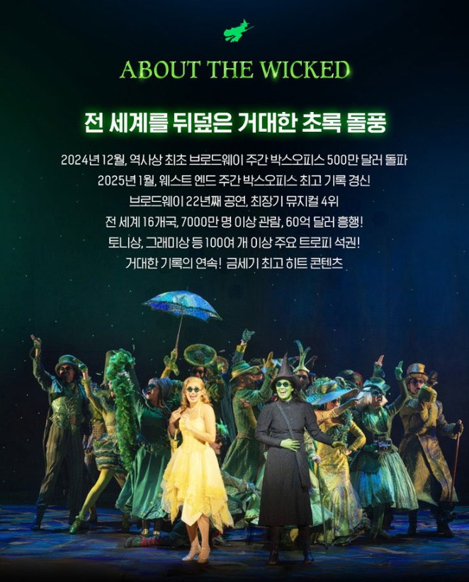 뮤지컬 〈위키드〉 내한 공연은 오리지널 세계 최고 수준의 무대 연출과 배우들의 퍼포먼스를 직접 확인할 수 있는 기회입니다. 절대 놓치지 마세요!